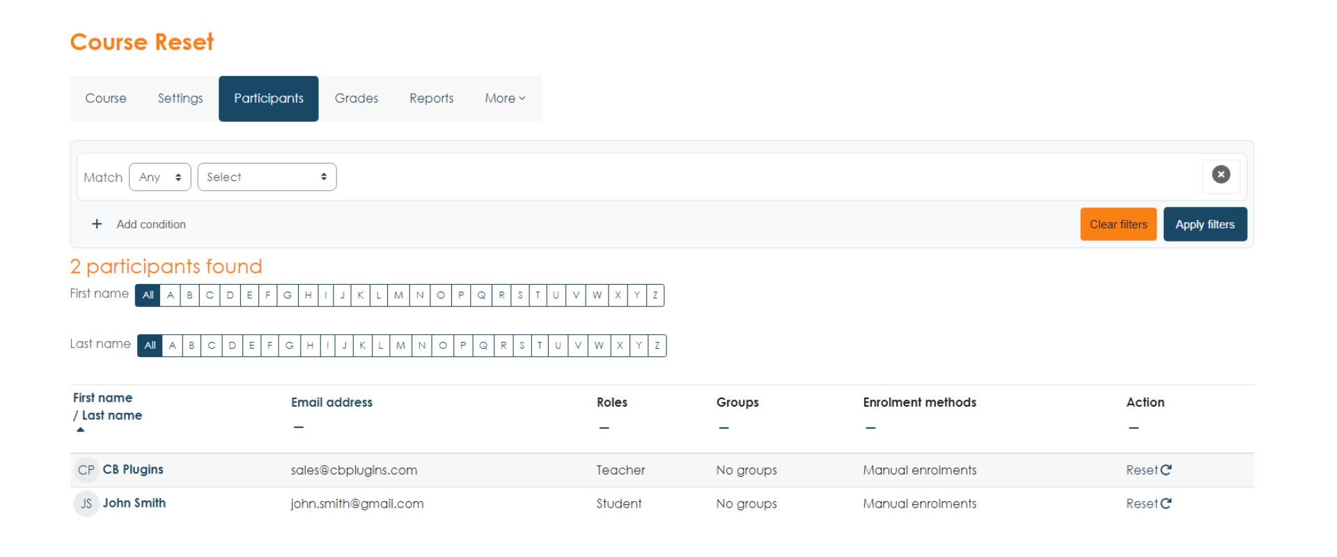 Help administrators easily reset student progress for all Moodle activity types within a course. Whether it's a SCORM course, a quiz, or an assignment, this plugin ensures that you can bring a student's attempts back to their initial login state with just a few clicks.